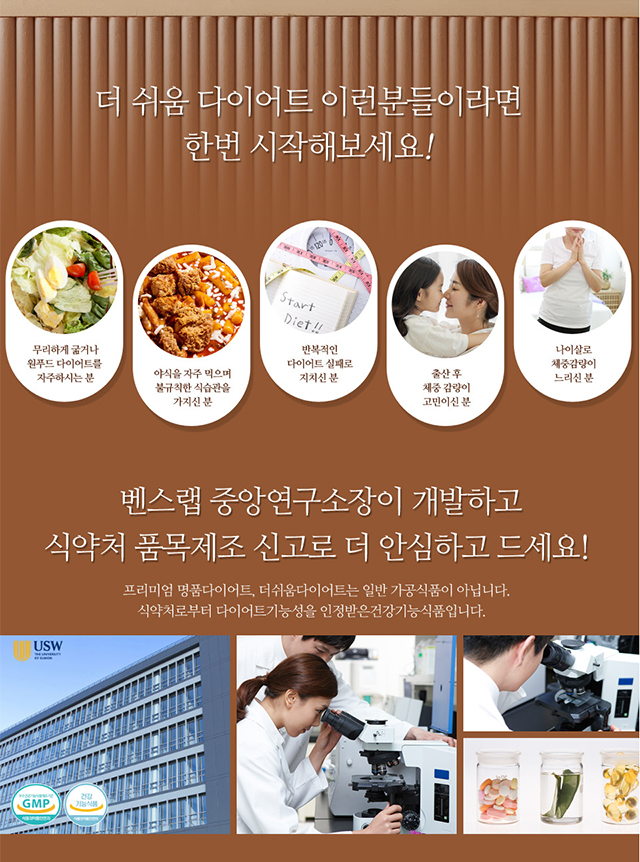 더쉬움다이어트는 수원대학교 정종문 교수님 과 밴스랩 연구진의 수년간 연구와 개발을 통하여 만든제품으로 밴스랩 특허성분 슬림피드(파이토 혼합 추출물배합) 기술이 들어간 다이어트제품입니다.
