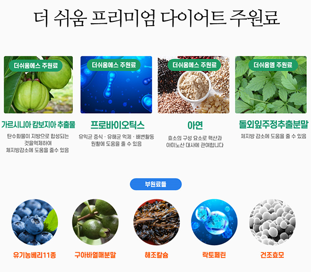 (체지방감소의 시너지효과를 증대 해주고 유산균 혼합분말과 슈퍼배리로 불리는 유기농베리 혼합분말이 들어가있어 다이어트와 활력을 증진시켜주는 역할을 함)