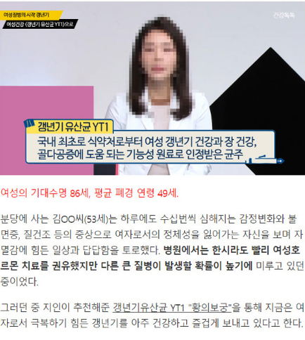 국내 최초 개발되어 식약처 기능성을 인정받은 여성 갱년기 유산균인 락토바실러스 아시도필러스YT1 "황의보궁"은 여성호르몬을 외부에서 인위적으로 보충하는 방식이 아닌 이미 내 몸안에 있는 여성호르몬 에스트로겐이 활성화 될 수 있도록 도움을 주는 유산균입니다.