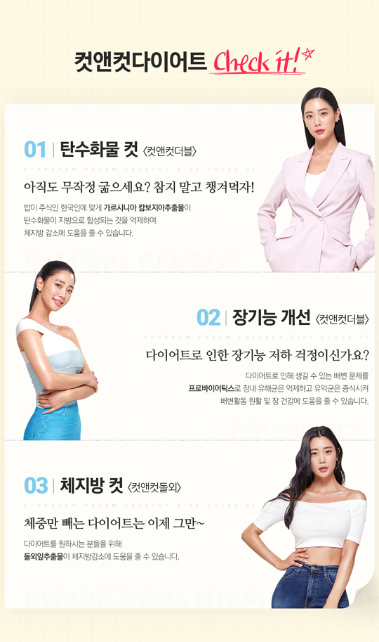 아름다움과 건강을 추구하는 64년 전통의 경남제약에서 만든 컷앤컷다이어트는 식품의약안전처로부터 기능성을 인정 받은 성분으로 만들었습니다.