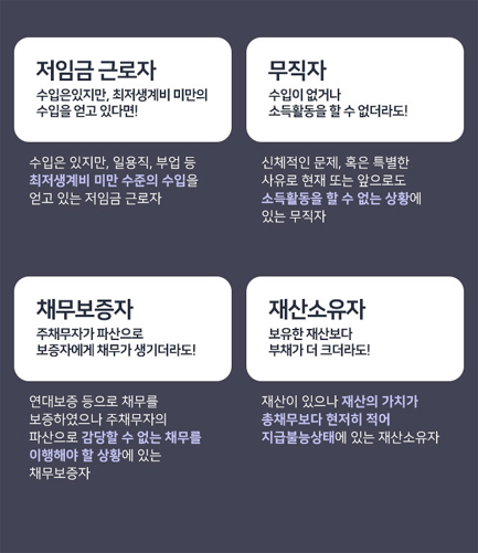 개인파산 신청자격 재산이 없고 부채가 현저히 많은 경우, 현재 계속적 혹은 반복적인 소득이 없거나 소득이 있어도 생계비 이하인 경우, 건강 또는 특별한 사유로 소득 활동을 못하는 경우이며, 신용불량자가 아니여도 신청가능합니다.