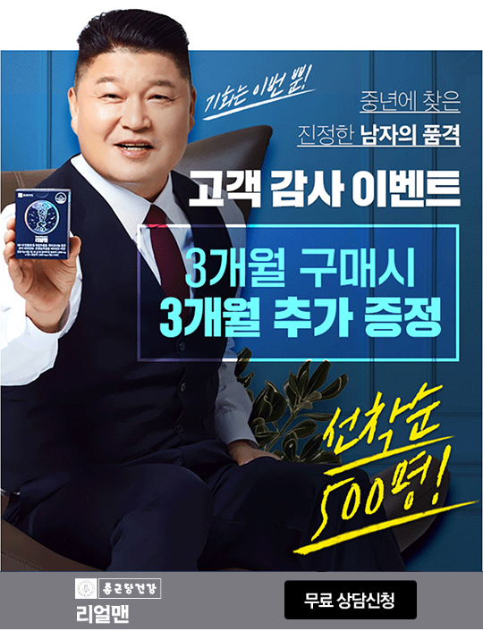 강호동 광고 종근당건강리얼맨은 나이가 들수록 줄어드는 남성호르몬을 개선해 줄 뿐만 아니라, 혈행을 개선하여 중년 남성의 혈류 흐름을 원활하게 도와 주며 지구력 증진에 도움을 주어 지치지 않는 체력을 유지할 수 있도록 돕습니다.