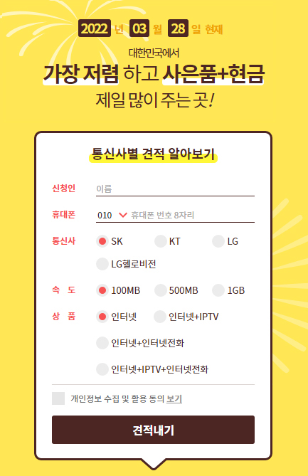 2022년 03월 28일 현재 대한민국에서 가장 저렴 하고 인터넷가입현금지원 + 인터넷가입사음품많이주는곳!