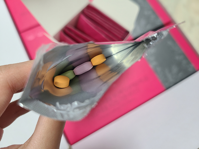 갱년기 제품인지 모르도록 산뜻한 패키지로 디자인되었으며,하루 1번으로 간편하게 챙길 수 있고, 알록달록한 정타입의 제품으로 섭취시에도 행복한 기분으로 섭취할 수 있는 제품입니다.
