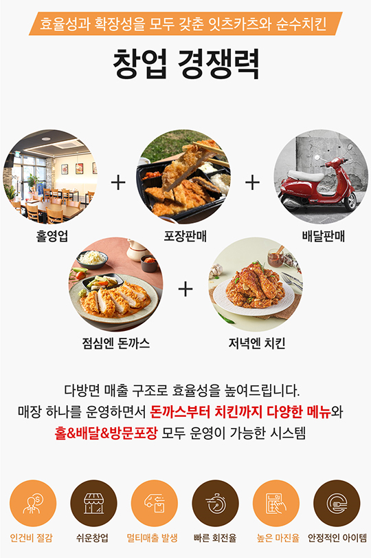'홀영업 + 매장판매 + 배달판매 + 점심엔 돈까스 + 저녁엔 치킨'
