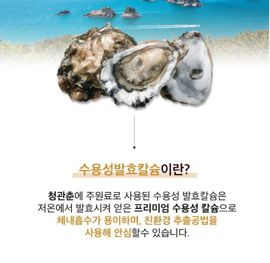청관춘에 주원료로 사용된 수용성 발효 칼슘은 저온에서 발효시켜 얻은 프리미엄 수용성 칼슘으로 체내 흡수가 용이하며, 친환경 추출공법을 사용해 안심할 수 있습니다.