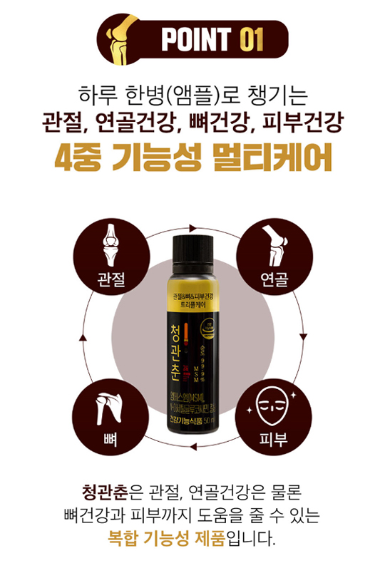2. 청관춘 하루 한 병으로 관절 건강 · 뼈 건강 · 연골 건강 · 피부 건강까지 케어하세요.