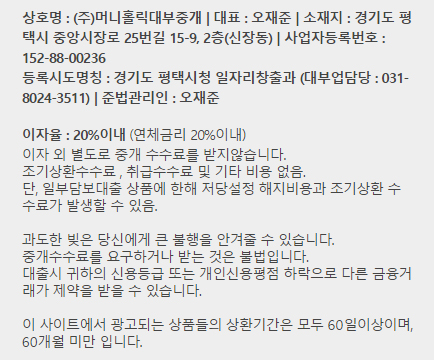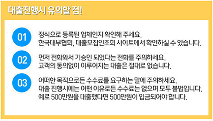 ① 정식으로 등록된 업체인지 확인해주세요 (한국대부업체 대출모집인 조회 사이트에서 확인할 수 있습니다)