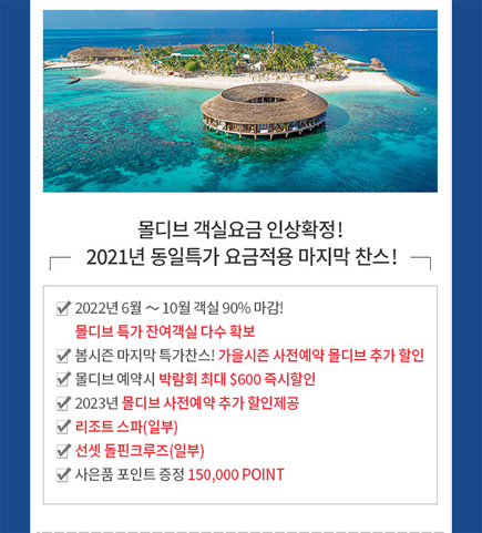 이벤트 #1. 2022년 6~10월 객실 90% 마감~! 몰디브 특가 잔여객실 다수 확보
