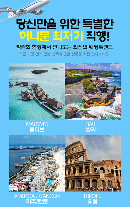 안산웨딩박람회 현장에서 만나보는 최신의 해외 신혼여행지 경비 특가 혜택으로 만나보세요.