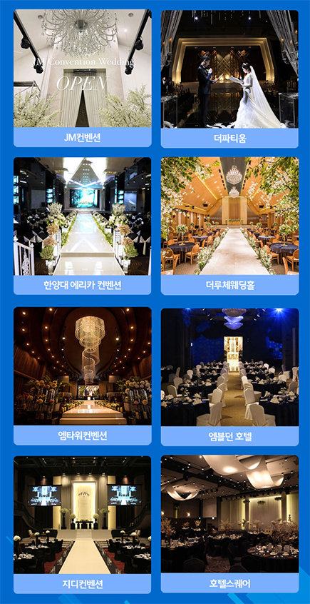 "JM컨벤셭 | 더파티움 | 한양대 에리카 컨벤션 | 더루체웨딩홀 | 엠타워컨벤션 | 앰블던 호텔 | 지디컨벤션 | 호텔스퀘어"
