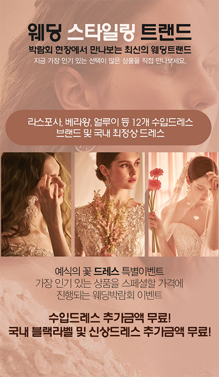 용인 웨딩페어 박람회 현장에서 만나보는 최신의 웨딩 트렌드 '라스포사를 비롯하여 베라왕, 얼루이 등 12개 수입드레스 브랜드 및 국내 최정상 드레스' 가장 인기 있는 상품을 스페셜할 가격에 진행하세요.