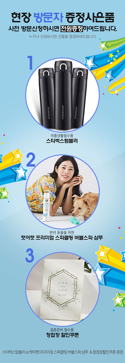 사전 방문신청하시면 '여름 생활 필수품 스타벅스 텀블러 or 반려 동물을 위한 펫어펫 프리미엄 스파클링 버블스파 샴푸 & 청텁장할인 쿠폰 & 현장 계약자 웨딩다이어리 ' 증정하여드립니다.