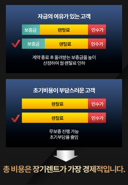 · 월렌탈료는 보증금 유/무, 차량의 할인률, 인수할 때 내는 인수가격으로 결정