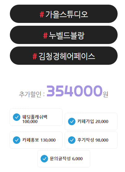 셀프웨딩스드메 비용 총 354,000원 추가 할인까지 받으실 수 있도록 최적의 스드메견적 리포트를 제공해드린다고 하네요.