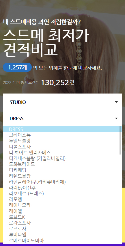 스드메 최저가 견적비교 1,257개의 모든 업체를 한눈에 비교하시고 웨딩박람회 발품 보다 더 저렴하게 앉아서 비교하고 앉아서 할인 받기 얼마나 저렴할지 모르는 일이잖아요 ^^ㅣ익,,