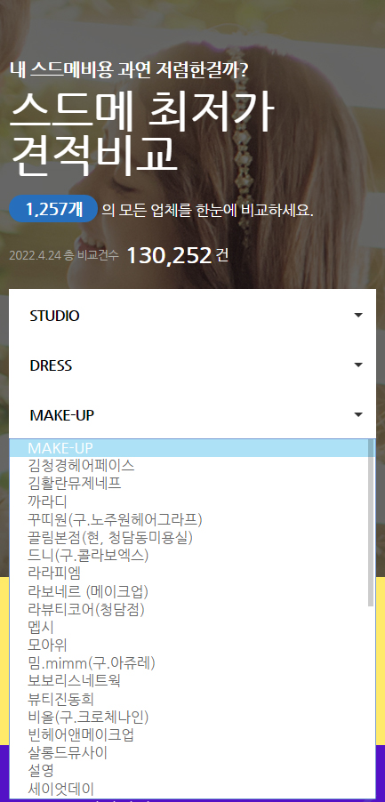 스드메 비용 비교할수록 커지는 혜택 1,257개의 모든 업체를 스드메견적 비교하시고 혜택도 챙겨보세요 ~♥