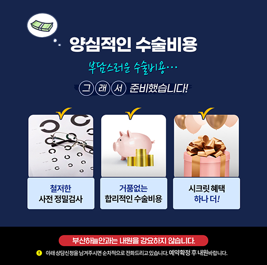 개인의 눈상태에 따라 라식라섹수술 가능여부와 프로그램이 달라 질 수 있기에 안과 정밀검사 후 정확한 여부 확인이가능하며, 이벤트 기간 내 상담 신청 후 방문하시는분들께 라식라섹비용 특별 혜택으로 만나보실 수 있기에 합리적 소비하시구요 ~♡