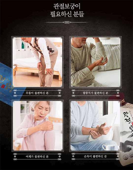중년의 뻣뻣해진 관절 불편함 이제 방치 하지말고 액상형 관절보궁 '보', 정제 형태의 먹는 관절보궁 '궁' 하루 두 번 먹고 마시는 이중케어로 시너지효과 중년의 관절건강 지키미로 사랑받고 있습니다.