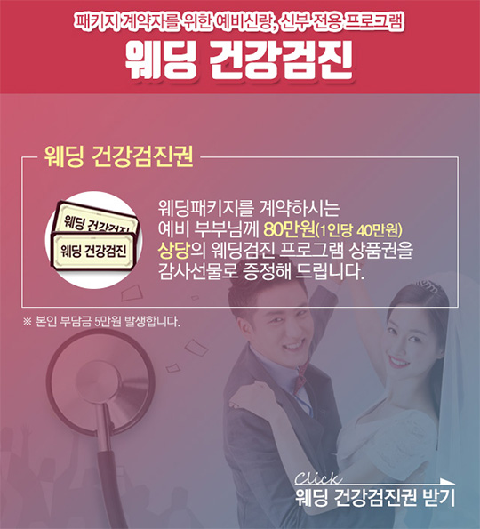 웨딩패키지를 계약하시는 예비부부께 80만 원 (1인당 40만 원) 상당의 웨딩검진 프로그램 상품권 증정