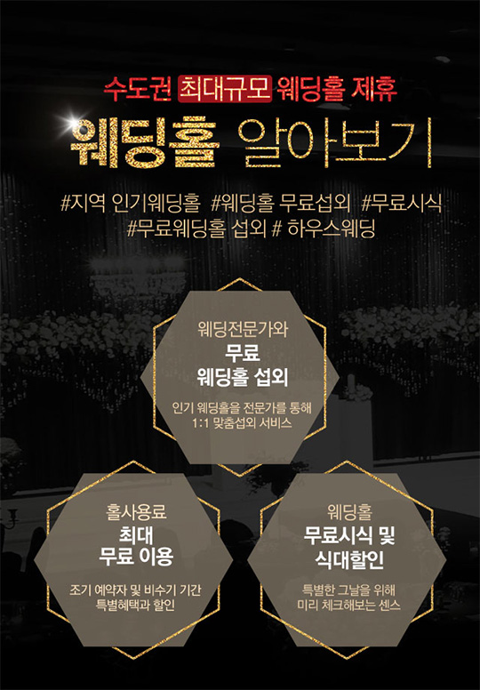 ① 웨딩전문가와 무료 웨딩홀 섭외 : 인기 웨딩홀을 전문가를 통해 1:1 맞춤 섭외 서비스