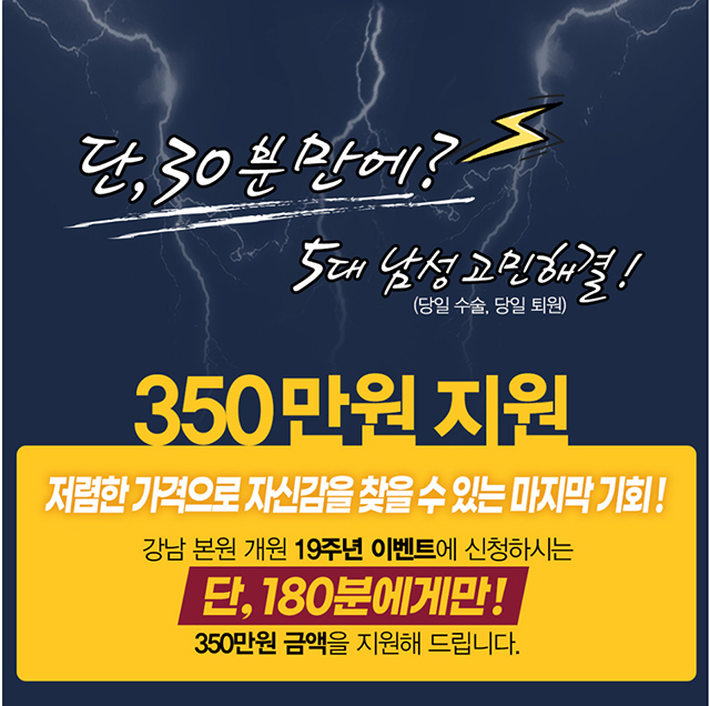 5대 남성 고민해결 (길이연장 · 음경확대 · 조루증 치료 · 귀두확대 · 발기부전 치료) 남성수술비용 저렴한 가격으로 자신감을 찾을 수 있는 마지막 기회 강남 본원 개원 19주년 350만 원 지원 이벤트 놓치기 아쉽다죠 ~♡