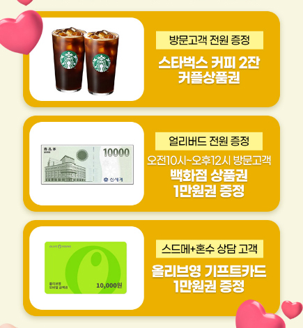 더불어 서울 웨딩드레스 페어 박람회 현장에 방문하신 모든 사전 예약 신랑 신부님들에게 드리는 '스타벅스 커피 2잔 커플 상품권 | 얼리버드 전원 증정 백화점 상품권 1만 원권 증정 | 스드메 + 혼수 상담 고객 올리브영 기프트카드 1만 원권 증정' 특별 선물도 챙기시고 기분 좋은 결혼 준비의 시간 되셨으면 좋겠어요 ~♥