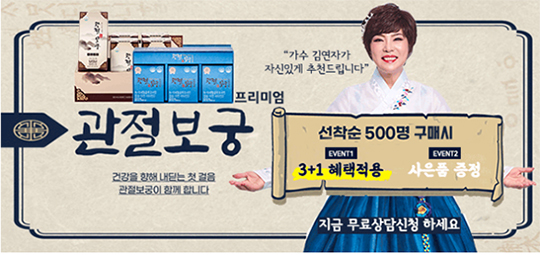 오늘은 가수 김연자의 건강한 관절을 위한 선택 관절보궁 3세트 구매 시 1세트 추가 증정 및 선착순 500명 한정 사은품 추가 증정 혜택 챙기시고 김연자관절보궁가격 10만 원이라도 절약 합리적 소비하시고 100세 인생 관절 건강 케어 지금 시작하세요 ~♡