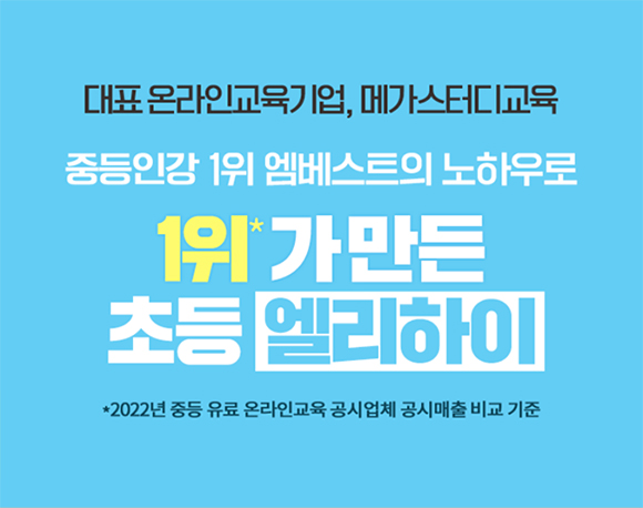 대표 온라인 교육기억 메가스터디교육 중등인강 1위 엠베스트의 노하우로 만든 상위 1%로 가는 첫 시작 초등인강 엘리하이 엠베스트 자녀의 주간/월간 학습 현황 및 관련 정보를 확인할 수 있는 엘리하아 학부모 매니저 앱 및 자기주도학습을 도와주는 담임선생님의 개별 맞춤 1:1 밀착 관리로 학습에 동기와 자신감을 심어줍니다.