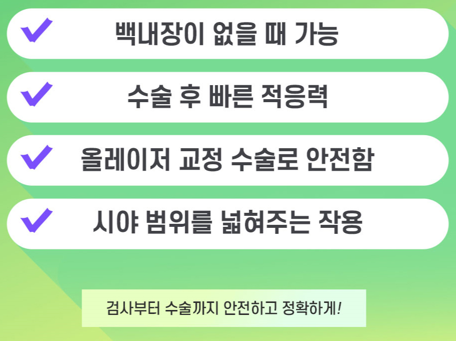 올레이저 라섹 수술 방법 첨단레이저로 정교한 각막상피 제거 알코올 비해 통증이 적고 시력 결과에 좋으며 회복이 굉장히 빠르다!