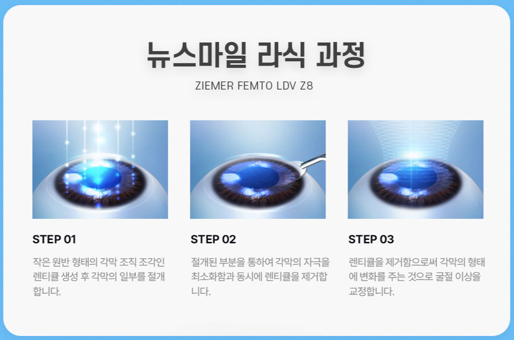 최소 절개로 각막 손상을 최소화하여 안구건조증 발생 확률을 줄였으며 난시와 관계없이 교정이 가능하다고 하네요.