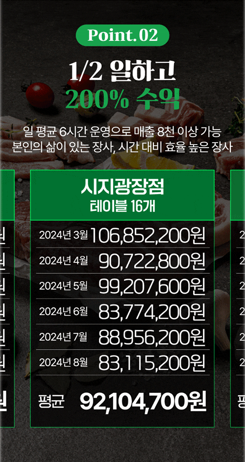 일 평균 6시간 운영으로 매출 8천 이상 가능 본인의 삶이 있는 장사, 시간 대비 효율 높은 장사를 추구합니다.