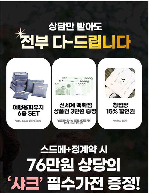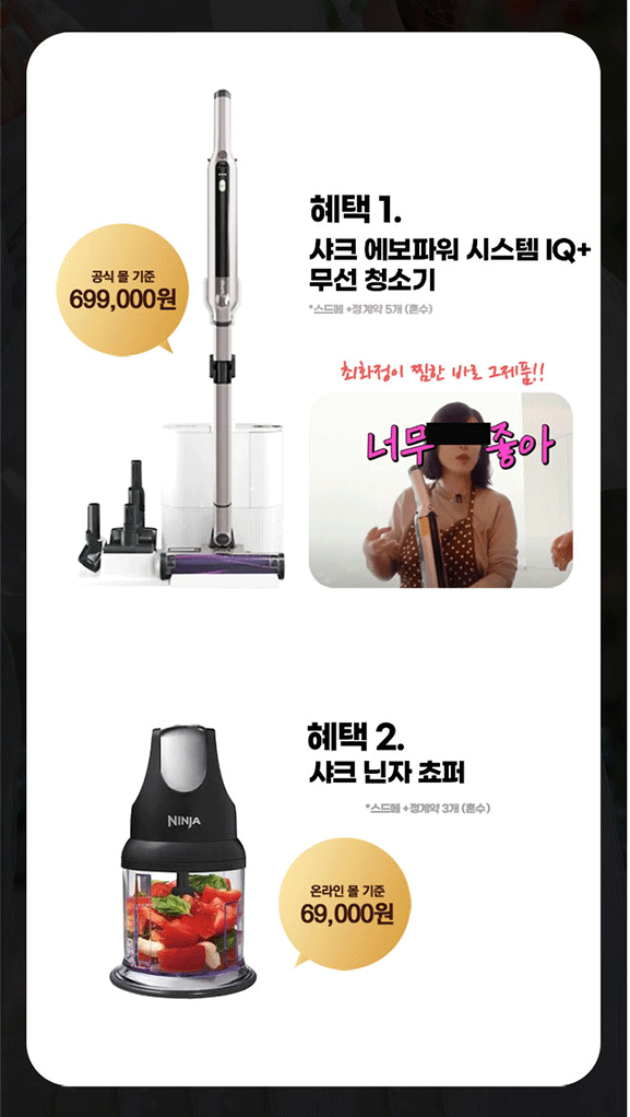 - 스드메 + 정계약 시 76만 원 상당의 샤크 에보파워 시스템 IQ+무선 청소기, 샤크 닌자 쵸퍼 증정
