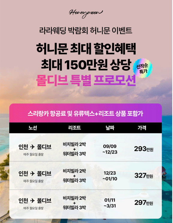 - 발리 유럽 카오락 칸쿤 하와이 몰디브 신혼여행 특별 프로모션 허니문 최대 할인 혜택